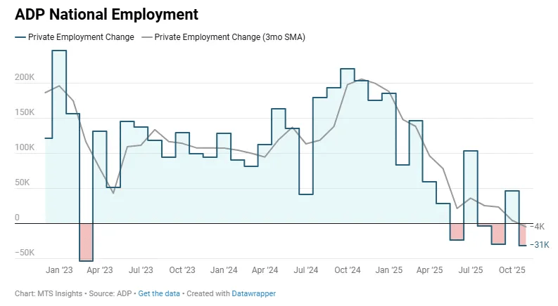 The case for Federal Reserve easing was further cemented by the latest ADP payrolls report, which revealed a surprising decline of 32,000 jobs in November—far below market expectations of a 10,000-job increase. This marked the steepest drop in private-sector employment since March 2023 and added to growing concerns about the health of the U.S. economy.