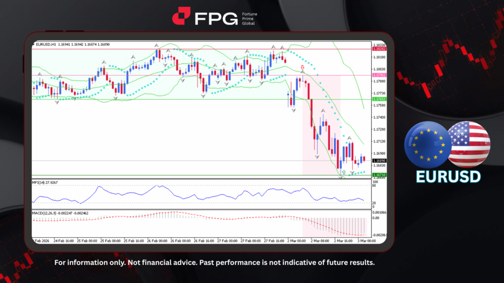 On the H1 timeframe chart, EURUSD had been moving steadily within a sideways channel for several weeks before finally experiencing a significant price breakdown. This bearish momentum started from 1.1795 and dropped sharply to 1.1671. Following that decline, the pair staged a technical bounce and began stabilizing, with the current price hovering around 1.1689 under moderate volatility conditions. Although short-term consolidation is visible, the broader structure remains bearish after the decisive break below the previous range support.