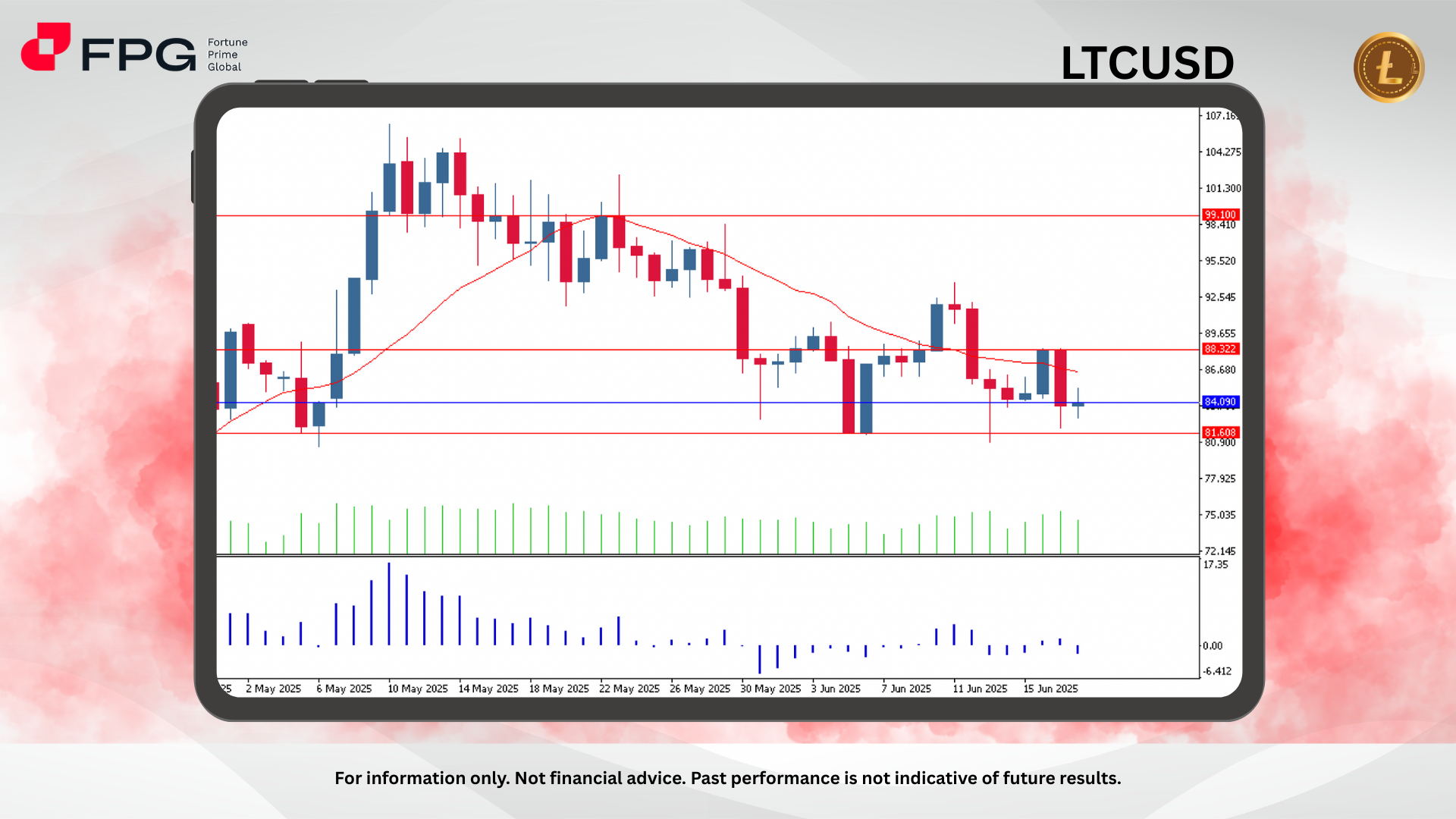LTCUSD traded around 84.09 and remains under bearish pressure after repeated failures to hold above the resistance zone at 88.32. Price is consolidating just above key support, indicating indecision, but with downside bias as momentum indicators continue to weaken.