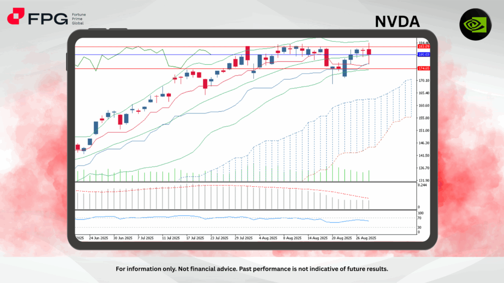 NVIDIA (NVDA) traded around 180.03, pausing after a strong rally over the past two months. The stock attempted to retest the 183.09 resistance zone but was unable to sustain upward momentum, resulting in a modest corrective pullback. Despite this rejection, the broader uptrend remains intact, underpinned by a steadily rising Ichimoku cloud and a consistent pattern of higher lows that continue to signal strength in the medium term.