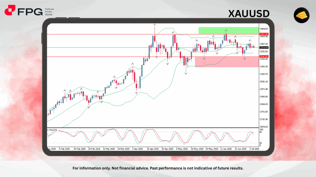 The most recent price action shows indecision near the mid-range (~3324.84), with candles showing wicks on both ends, signaling tug-of-war between buyers and sellers. The price briefly dipped below the lower Bollinger Band in late June but quickly reversed, indicating strong demand in the red demand zone between 3247.83 and ~3165, which has acted as dynamic support multiple times. Meanwhile, the green supply zone above 3437.30 has capped bullish attempts, confirming the importance of this ceiling for any continued upside move.