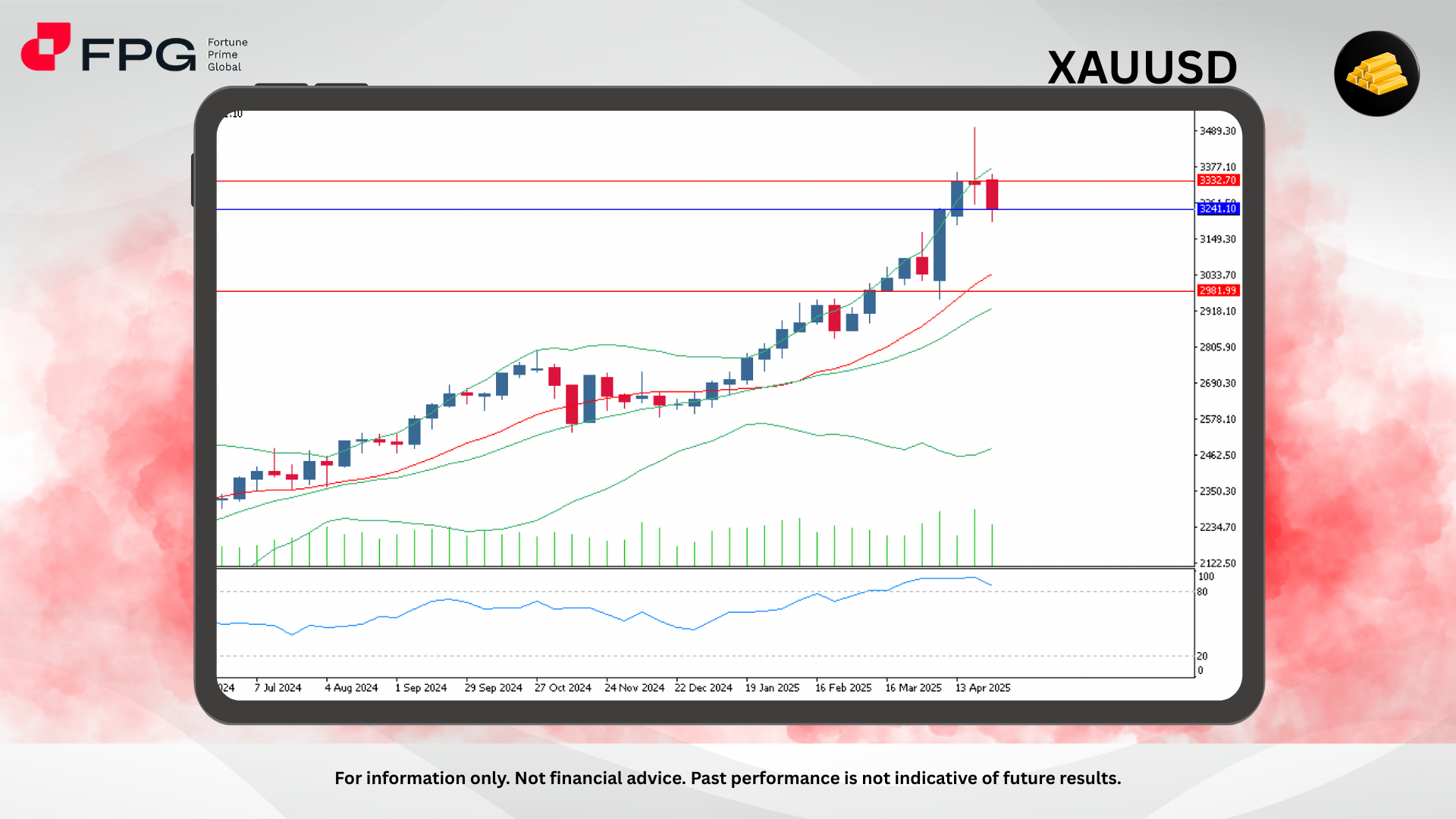 XAUUSD is currently around 3241.10, having recently pulled back after testing major resistance at 3332.70. While the broader trend remains bullish, the latest weekly candle shows a bearish rejection at the upper band, suggesting a short-term correction may be underway.